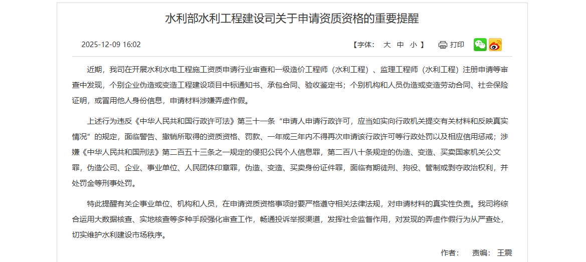 水利部水利工程建設司關于申請資質資格的重要提醒