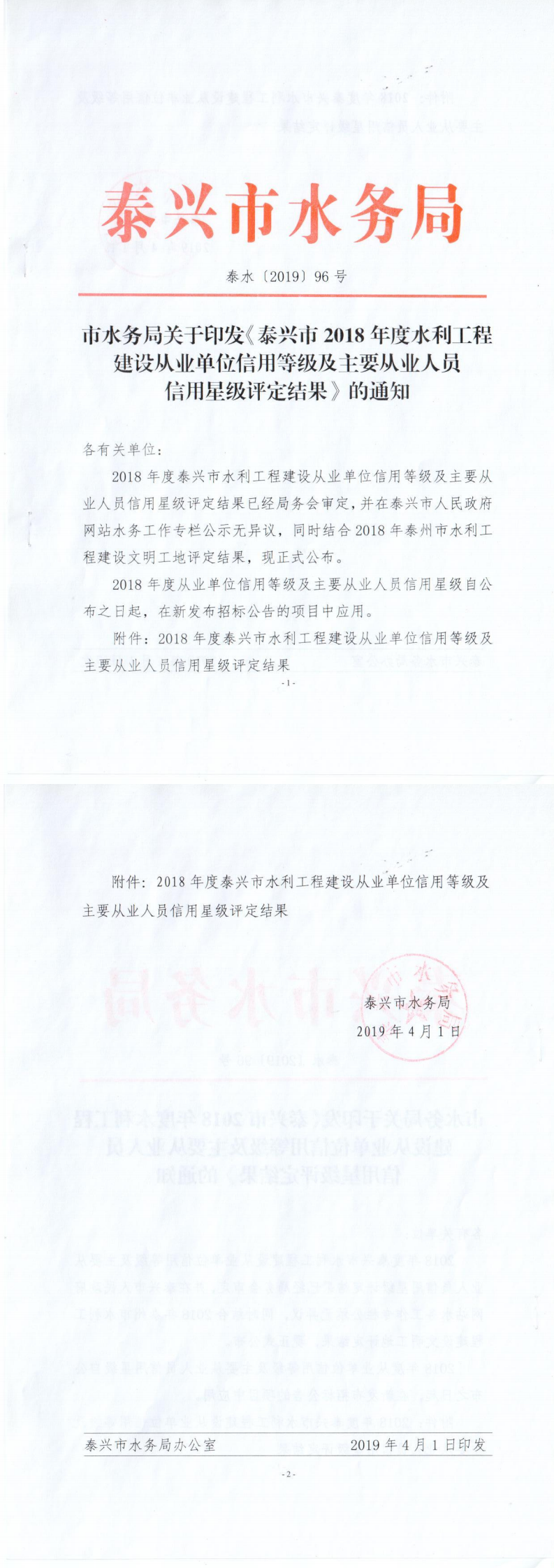 2019年4月1日,泰興市是水務(wù)局印發(fā)《泰興市2018年度水利工程建設(shè)從業(yè)單位信用等級(jí)及主要從業(yè)人員信用星級(jí)評(píng)定結(jié)果》,我公司在泰興市2018年度水利工程建設(shè)從業(yè)單位信用等級(jí)被評(píng)定為A級(jí),主要人員何風(fēng)明信用星級(jí)為2星。