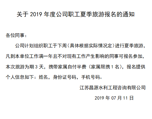 關于2019年度公司職工夏季旅游報名的通知
