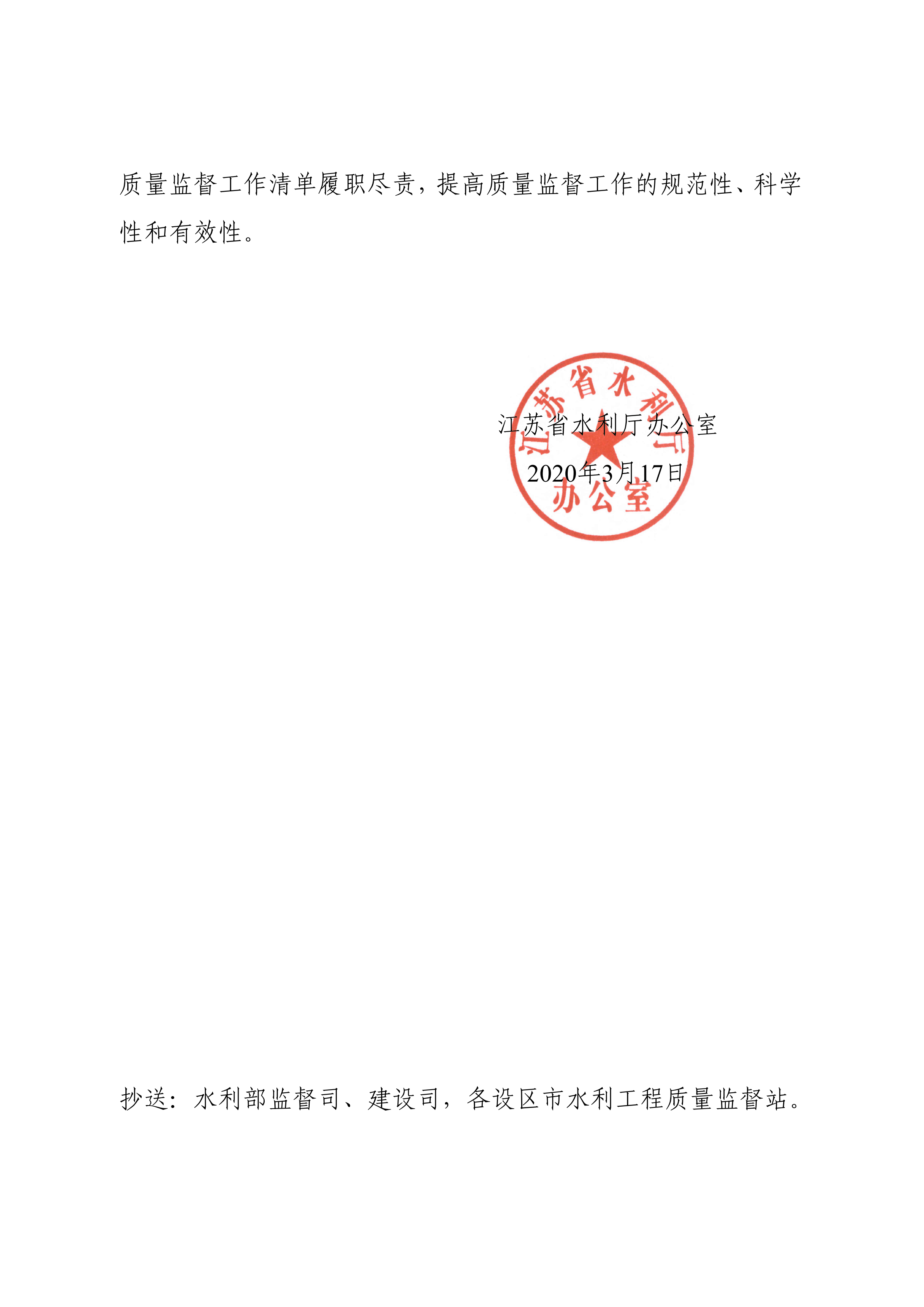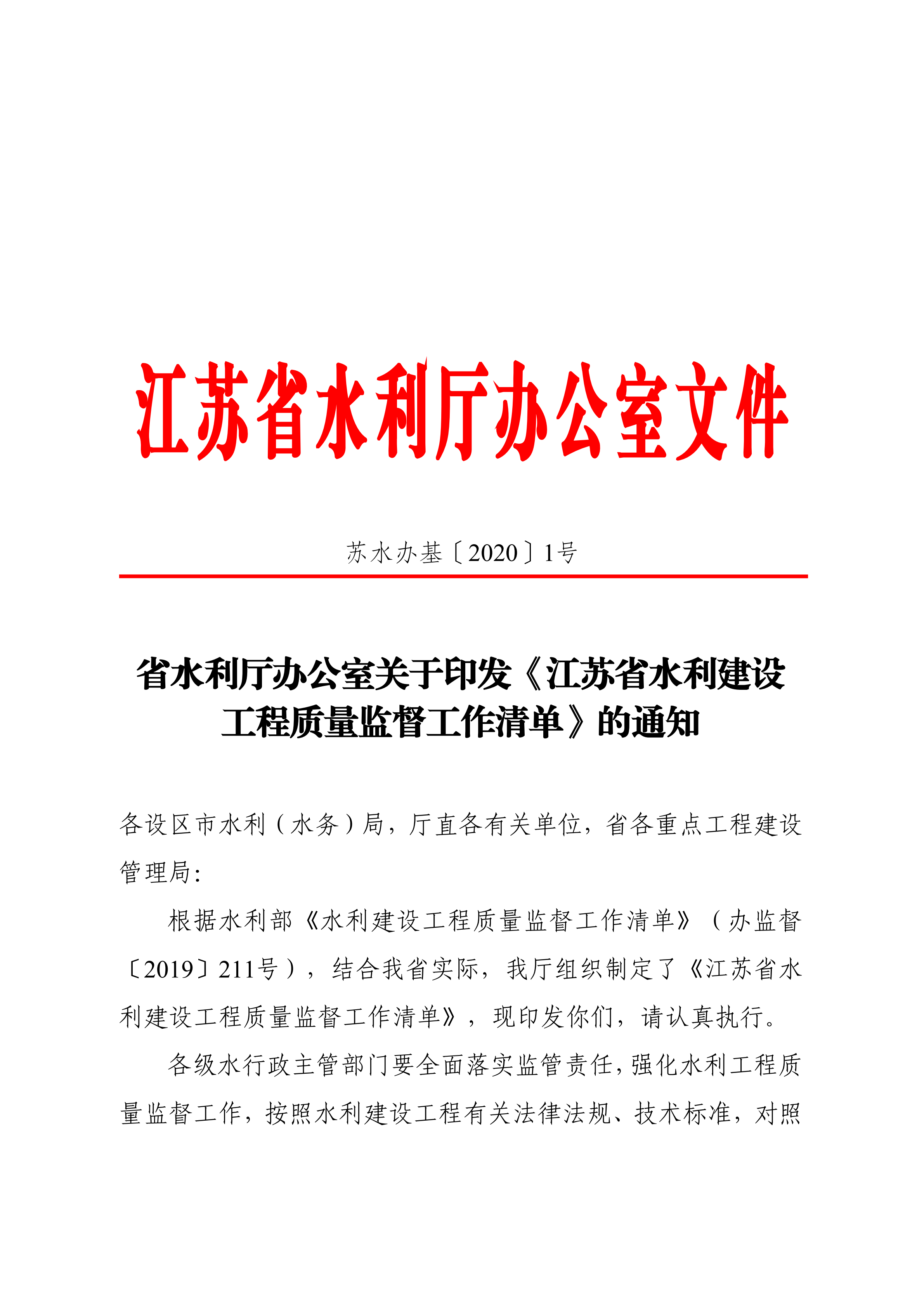 轉:省水利廳辦公室關于印發(fā)《江蘇省水利建設工程質(zhì)量監(jiān)督工作清單》的通知
